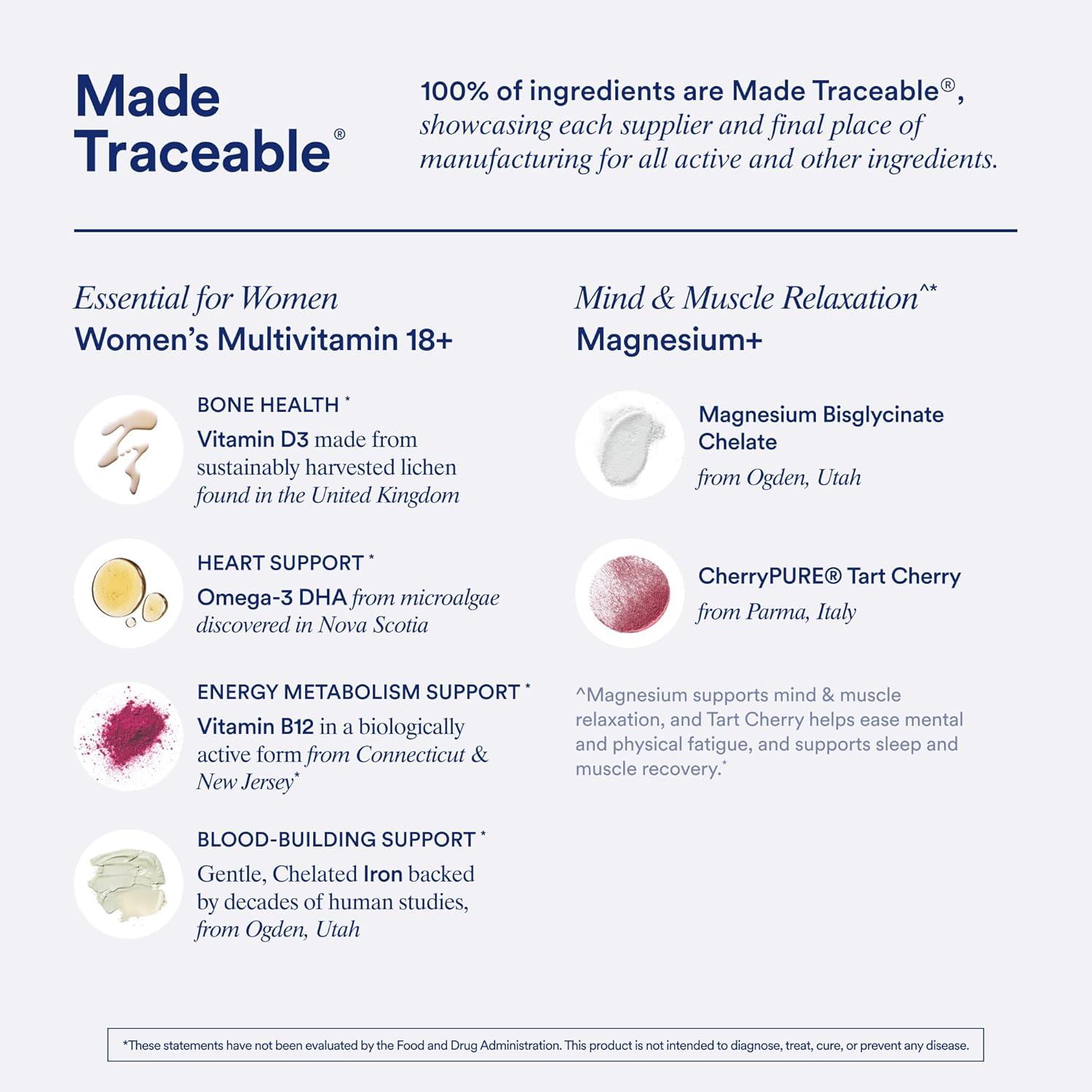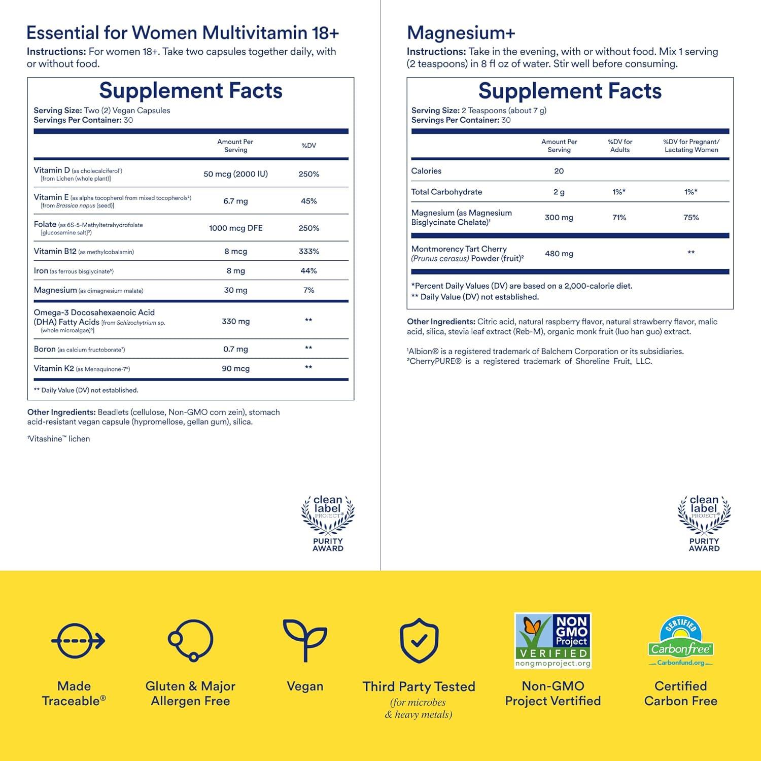 INGREDIENTS: Essential for Women 18+ supports foundational health needs with key nutrients such as Omega-3 DHA and methylated B12 for brain health and Vitamin D, and Boron for bone health, plus blood-building chelated Iron. Magnesium+ includes magnesium to support mind and muscle relaxation, as well as Tart Cherry to help ease mental fatigue, support sleep, and support muscle recovery.*