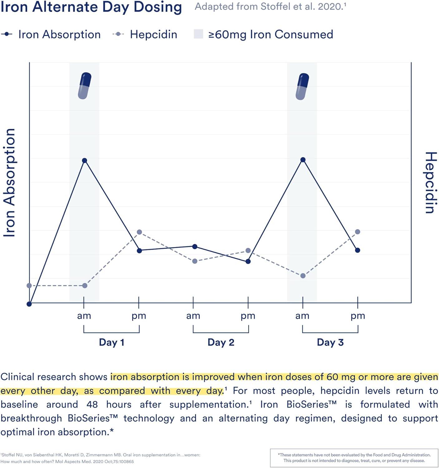DESIGNED FOR OPTIMAL ABSORPTION: BioSeries Technology combined with alternate-day dosing, designed to support the release of iron when the body’s hepcidin levels are typically lower, for optimal iron absorption.*
