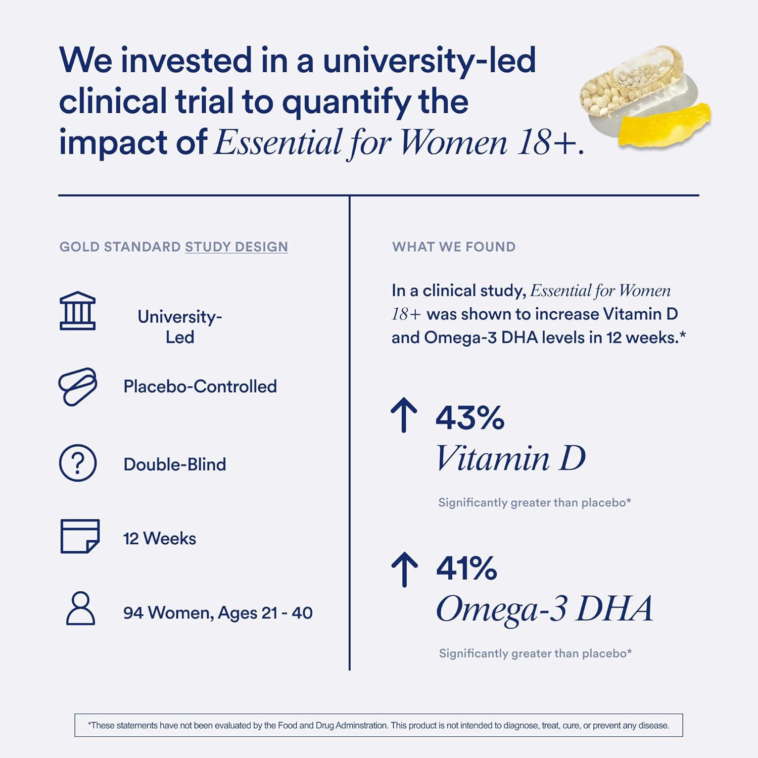 ESSENTIAL FOR WOMEN MULTIVITAMIN 18+: is the clinically-backed multivitamin for women 18-49 with 9 key clean, bioavailable nutrients to help fill nutrient gaps in their diet. Our formula is vegan, sugar-free, gluten-free, dairy-free, nut-free, soy-free, and formulated without stevia, sugar alcohols, and artificial colors, flavors, or sweeteners. Each serving provides 330mg of Omega-3 DHA.*