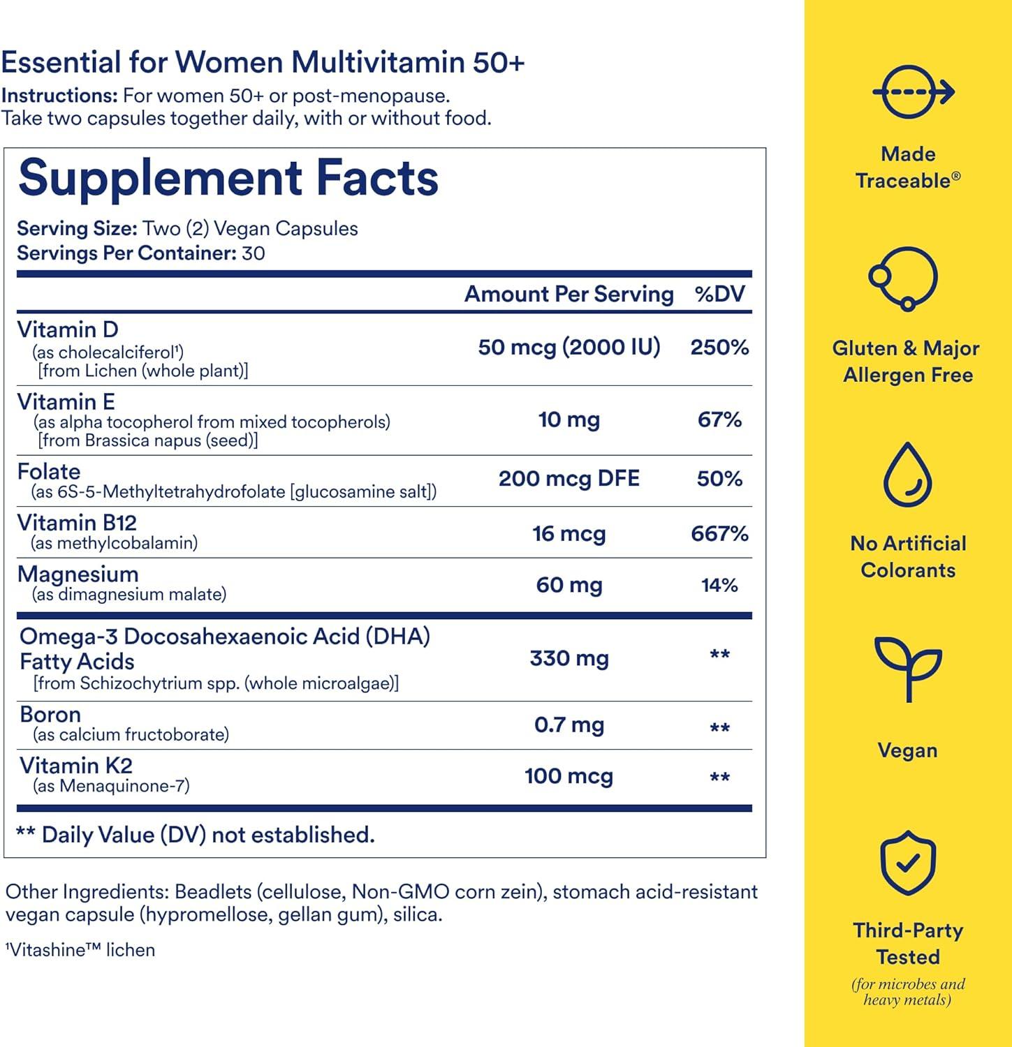 ESSENTIAL FOR WOMEN MULTIVITAMIN 50+: is the multivitamin reimagined for women post-menopause with 8 key nutrients to support healthy aging from within. Our formula is vegan, sugar-free, gluten-free, dairy-free, nut-free, soy-free, and formulated without stevia, sugar alcohols, and artificial colors, flavors, or sweeteners. Each serving provides 330mg of Omega-3 DHA.*