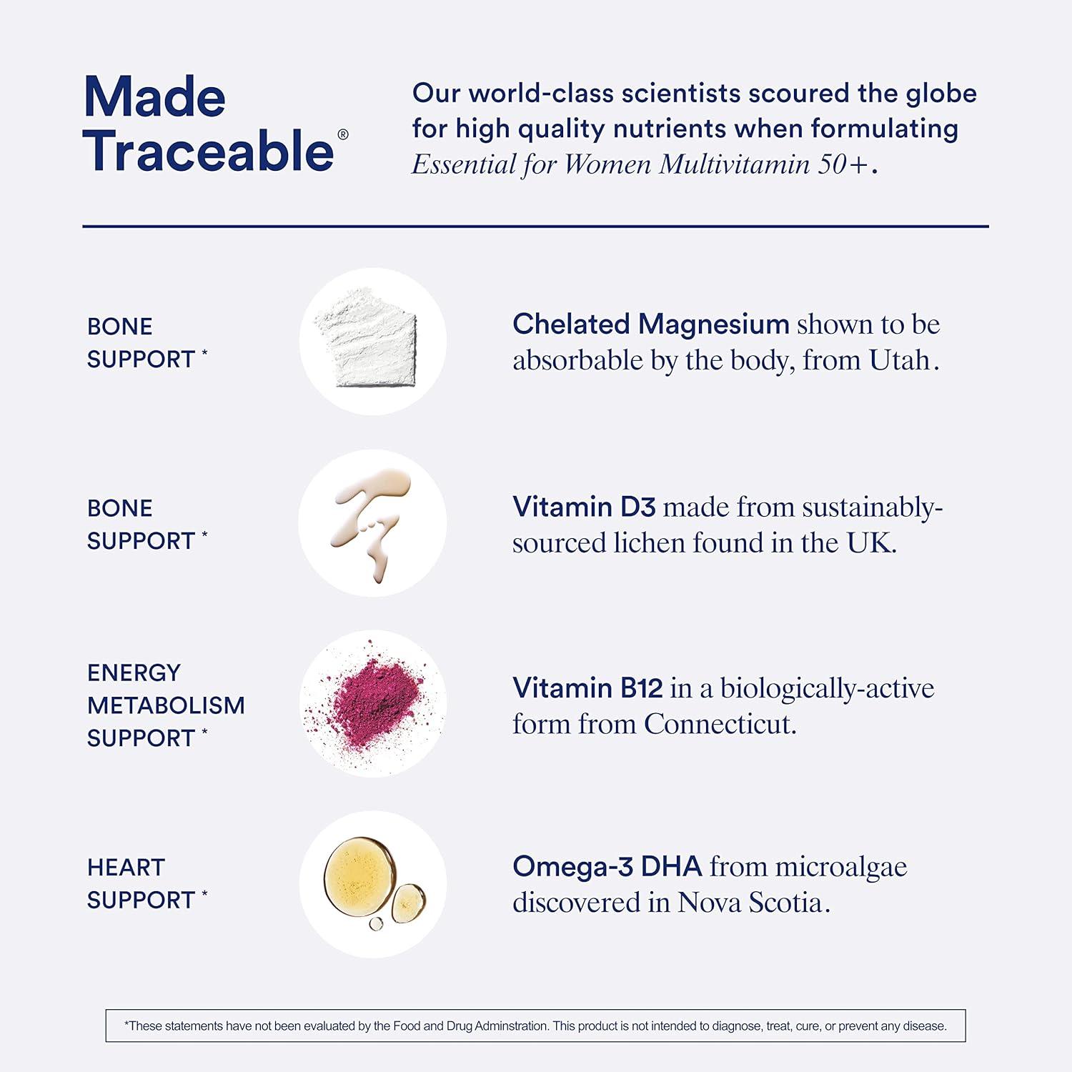 MADE TRACEABLE: Our world-class scientists scoured the globe for high quality ingredients when formulating Essential for Women Multivitamin 50+. Our formula includes Chelated Magnesium shown to be absorbable by the body, from Utah – for bone support, Vitamin D3 from sustainably-sourced lichen found in the UK – for calcium absorption support, Biologically-active Vitamin B12 from Connecticut – for brain support, and Omega-3 DHA from microalgae discovered in Nova Scotia – for heart support.*